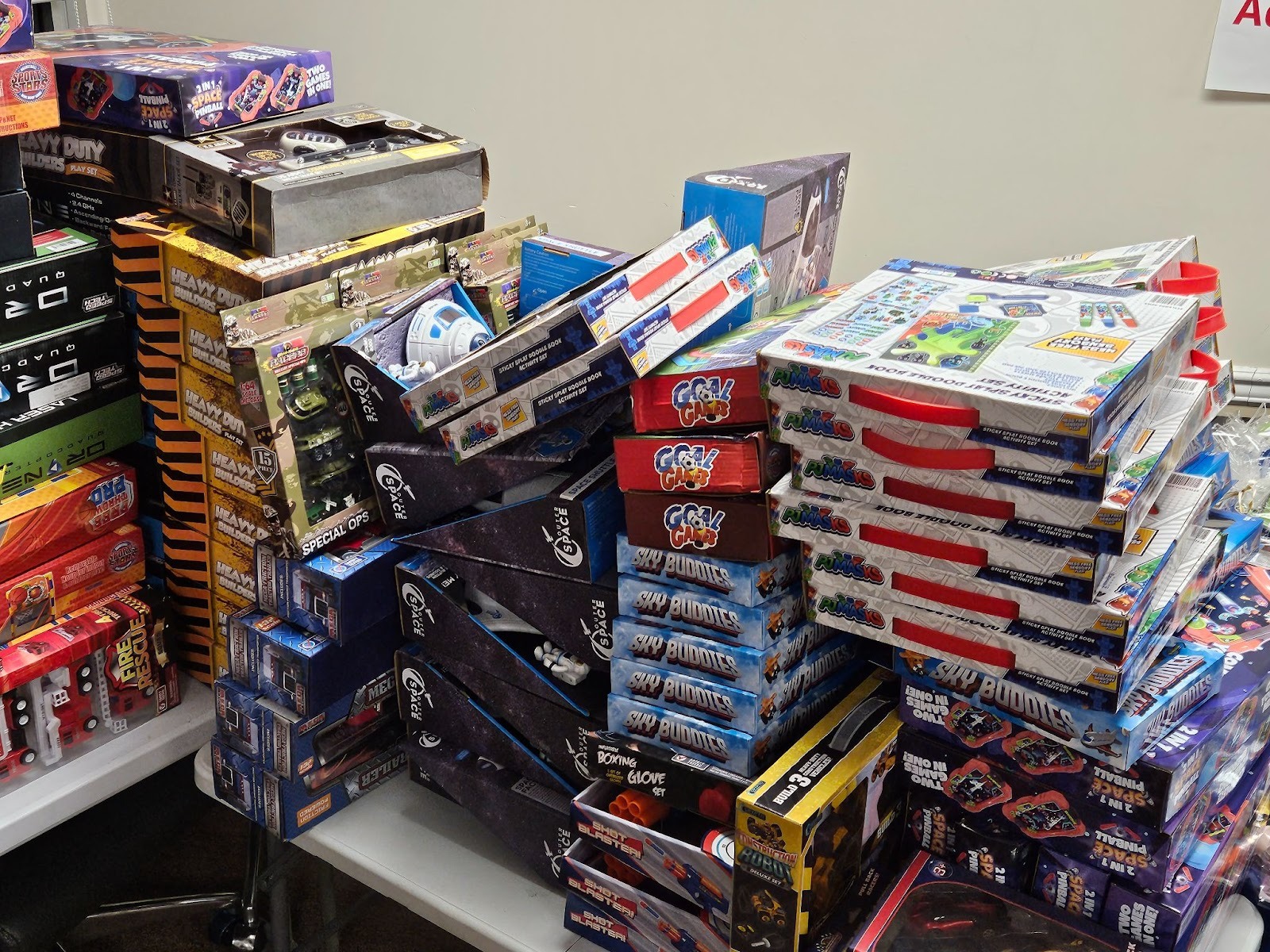 Piles of games and toys donated through toy drives for distribution to hospitalized children