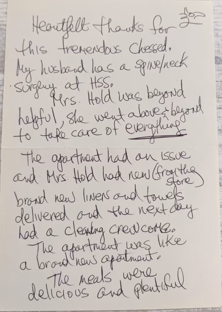 During my husband’s spine and neck surgery at HSS, Mrs. Hold and Chesed 24/7 provided a spotless apartment, fresh linens, and plentiful delicious meals—true above-and-beyond care.